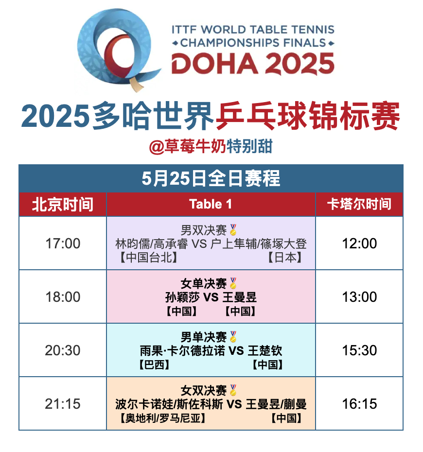 | 5月17-25日 | 2025多哈世界乒乓球锦标赛 | ITTF国际乒联 | 2000 | | 卡塔尔多哈 |